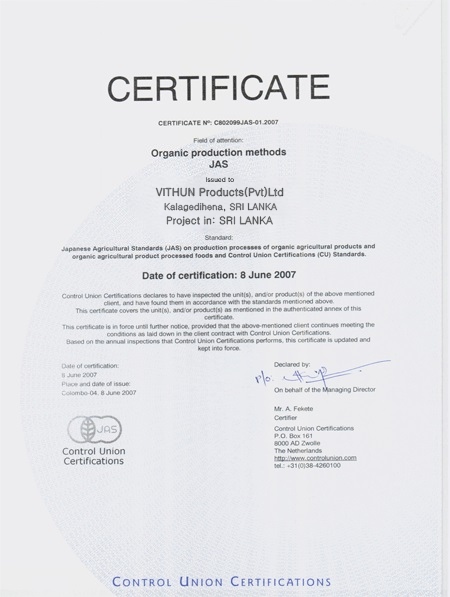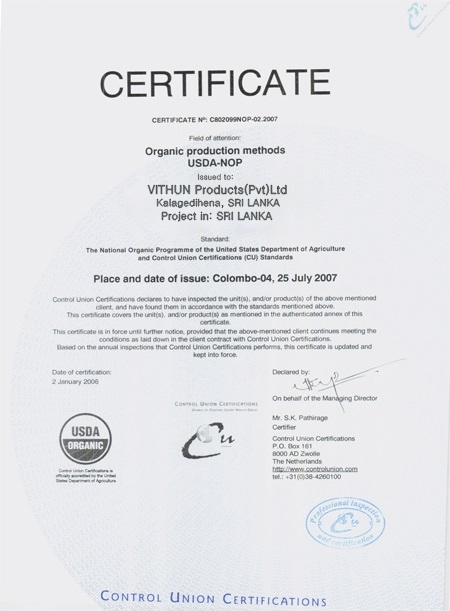 CertificatesWe would like to say proudly that our products have been certified as 100% Organic and health protective by outstanding Organizations not only in Sri Lanka, also in the Globe.______________________________________________________________________________________________________